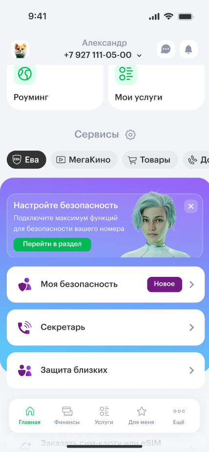 - 2На главном экране в блоке «Сервисы» выберите вкладку «Ева».